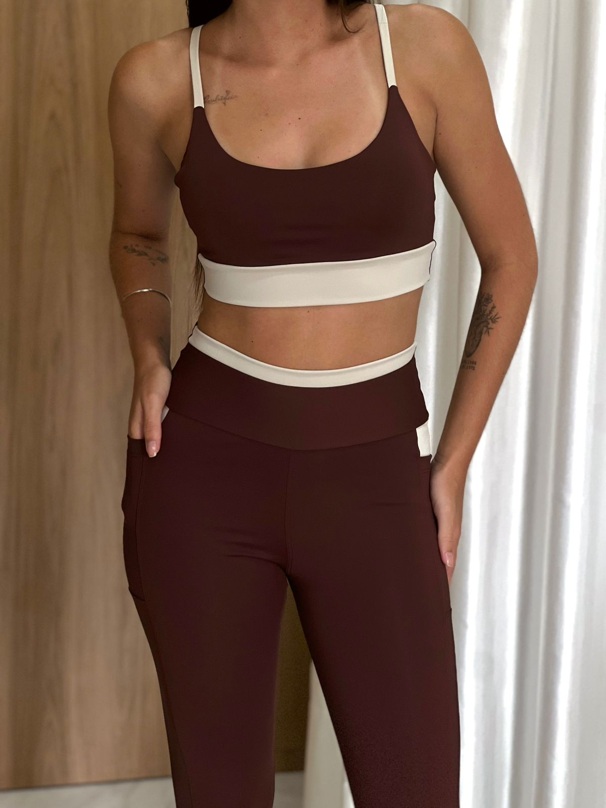 Top fitnes de alça marrom com off, bojo removivel. ZERO TRANSPARÊNCIA, garantindo alta cobertura. Tecido que facilita a evaporação de suor, transportando para fora do tecido e ajudando a manter a temperatura do corpo regulada. Exerce pressão uniforme sobre o corpo, protegendo e firmando a musculatura. Valoriza sua silhueta com recortes estratégicos e oferece ajuste perfeito, e máxima confiança durante o treino. Possui proteção UV.