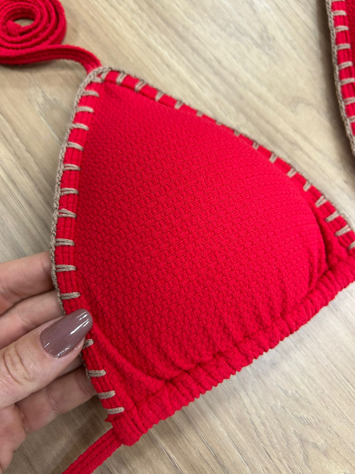 TOP BIQUINI CORTININHA VERMELHO COM DETALHE EM CROCHÊ NA COR MARROM | REF 4011V